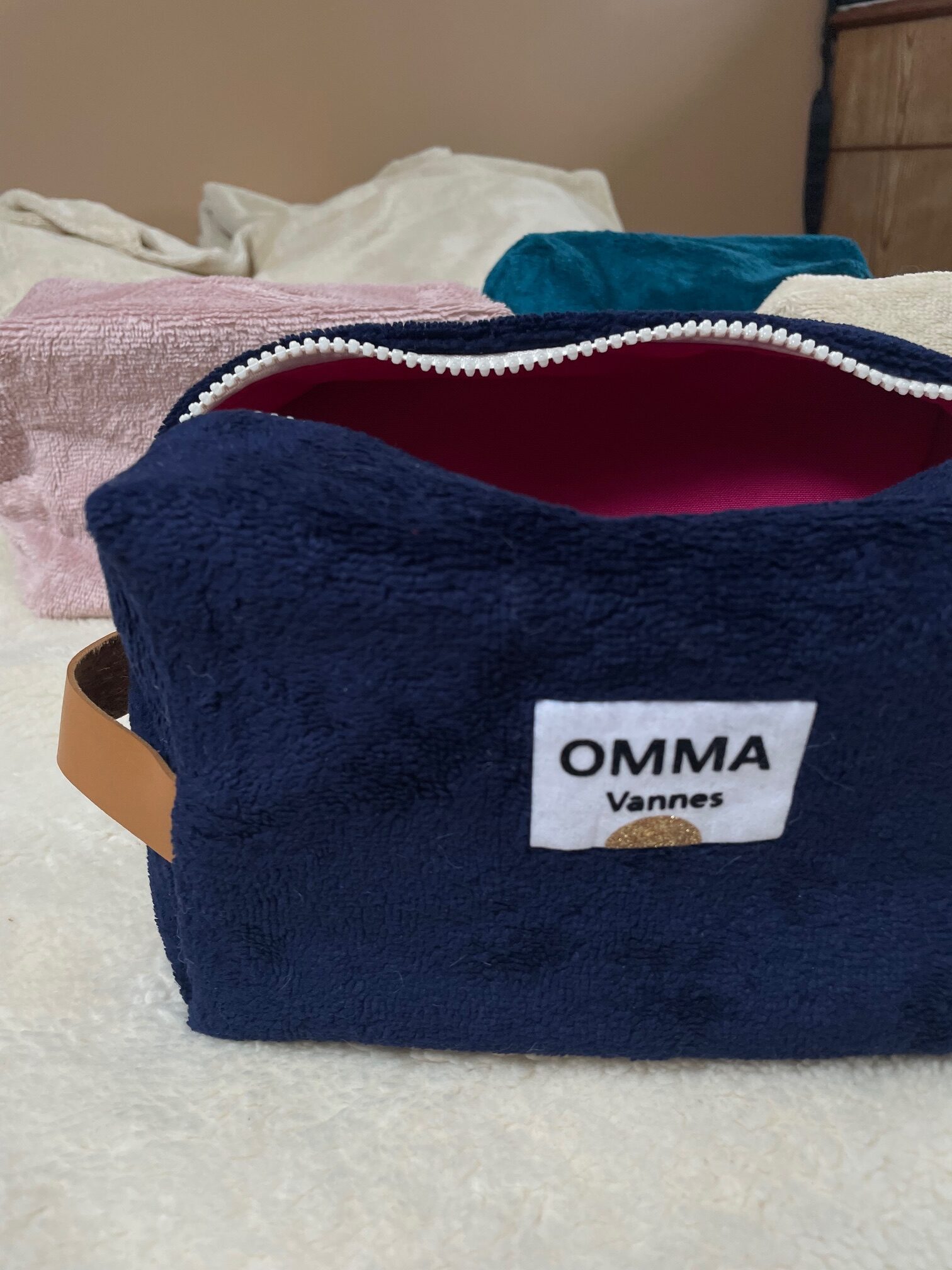 Les petites nouvelles de fin 2025: la trousse cube marinière et la trousse cerise! Rayée marine et blanc avec son zip orange fluo ou version cerise avec son zip camel et leur intérieur tissu écru imperméable.