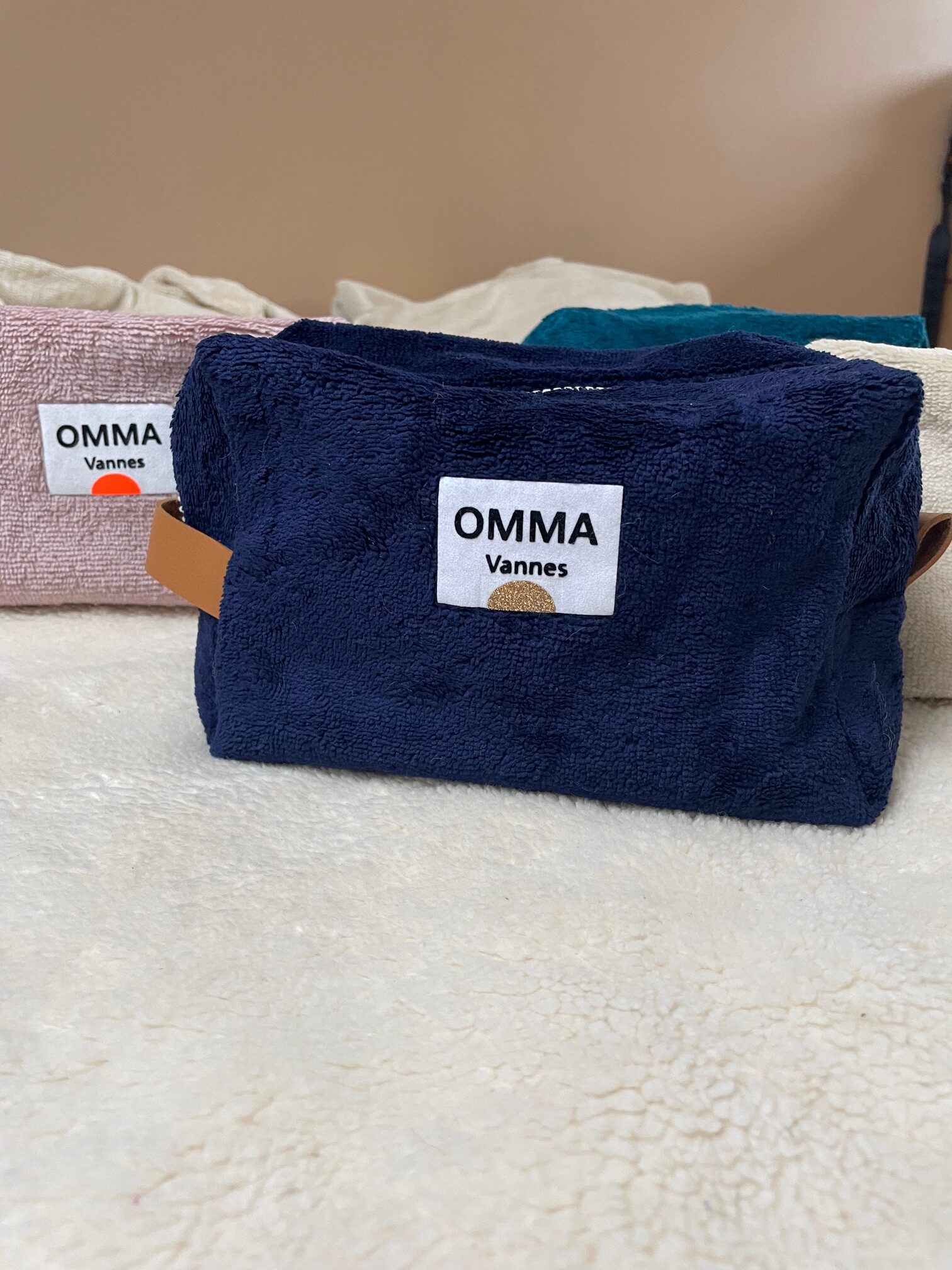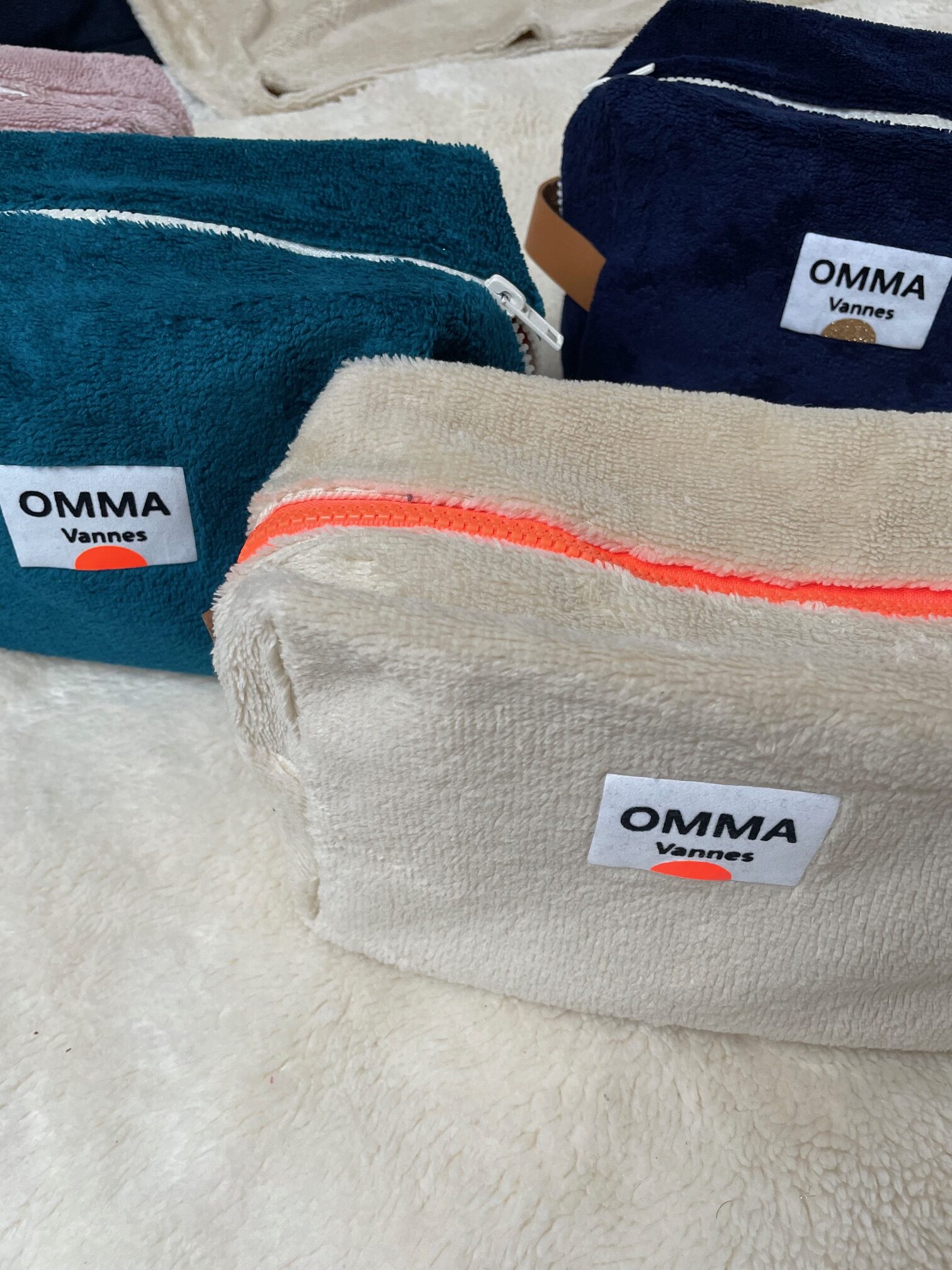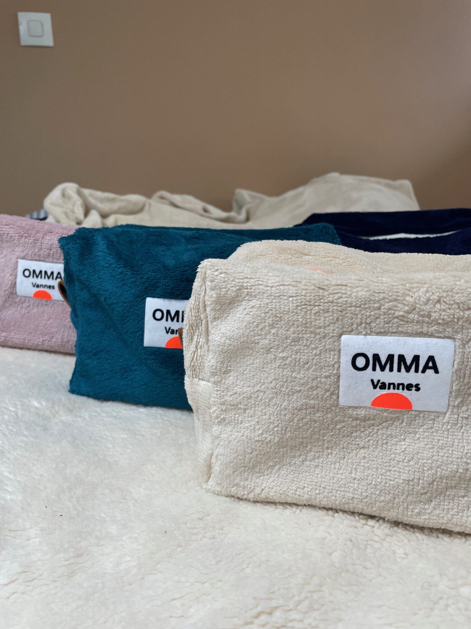 Logo OMMA en flex noir sur cadre velours blanc, soleil pailleté doré ou orange fluo, selon le modèle.