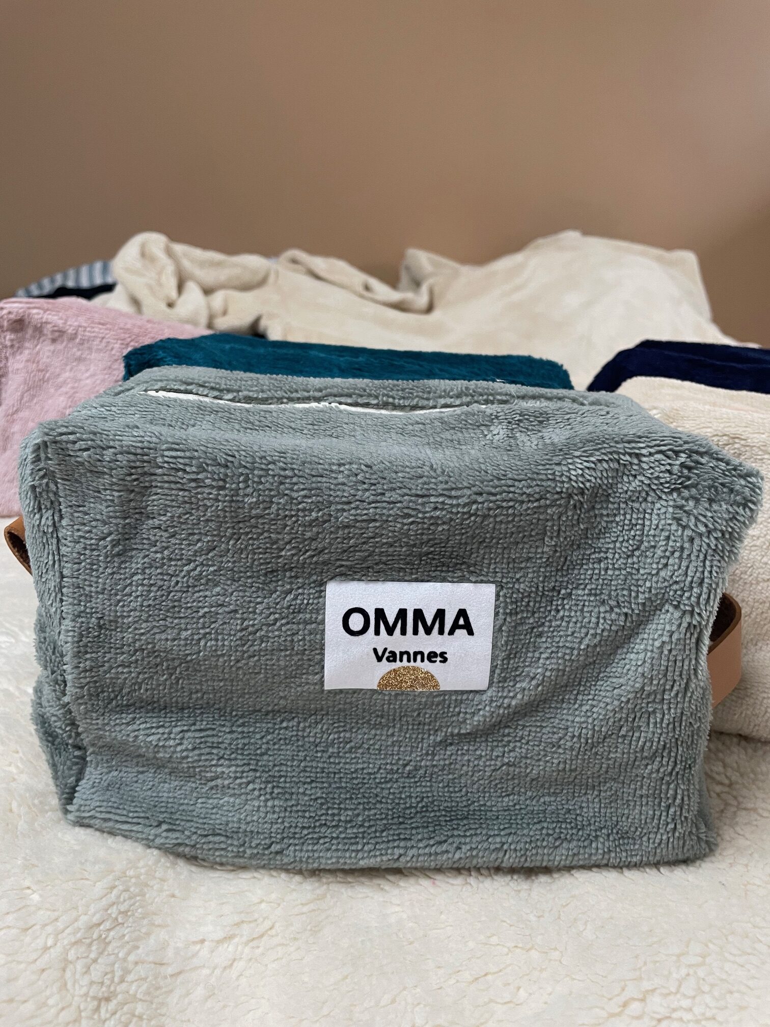 Tissu en éponge bambou à l’extérieur, tissu imperméable à l’intérieur. Petite poignée en cuir pour la préhension d’un côté, de l’autre: petite patte en cuir pour une finition élégante.